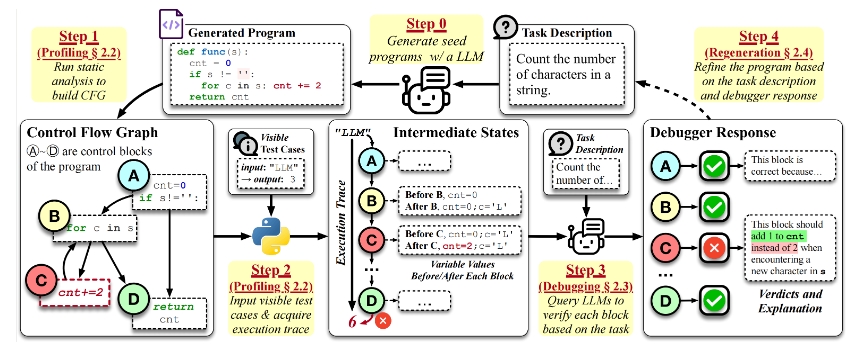 这是一种新型调试框架 LDB,该框架使大语言模型(LLMs)能够利用运行时执行信息来优化其生成的程序。具体来说,LDB模仿了人类开发者调试程序的方式。它将程序分割成基本块,并在整个运行时执行过程中跟踪每个块后中间变量的值。这使得LLMs能够集中于总体执行流程中的较简单代码单元,逐块核实它们是否符合任务描述,并高效地定位任何潜在的错误。