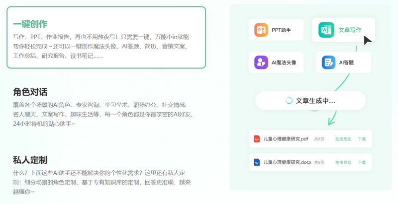 万能小in,智能AI助你轻松写作,智能对话助手快速解决你的各种问题。一键快速创作,学习工作报告,论文,毕业答辩,演讲稿,ppt,小红书笔记,活动策划,简历优化,魔法头像,脚本创作等。AI智能写作,使用自然语言大模型,创作更加高效!